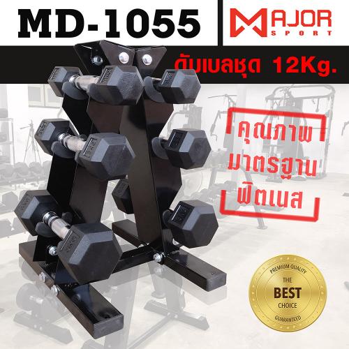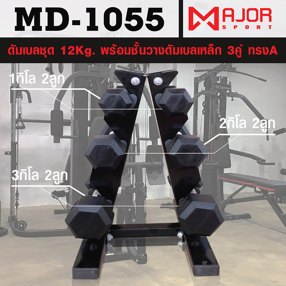 ดัมเบลหกเหลี่ยมหุ้มยาง ชุด 12Kg. พร้อมชั้นวางดัมเบลเหล็ก 3คู่ ทรงA รุ่น MD-1055