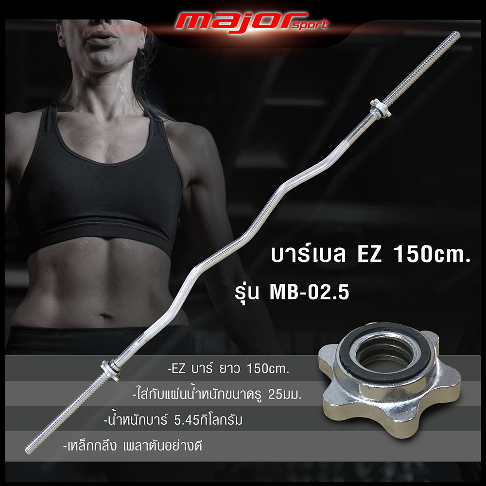 คานบาร์เบล แกนหยัก EZ Bar ขนาด 1 นิ้ว ยาว 150 cm.(ชุปโครเมี่ยม) + น็อตล็อคพร้อมซิลยาง 2 อัน รุ่น MB-02.5