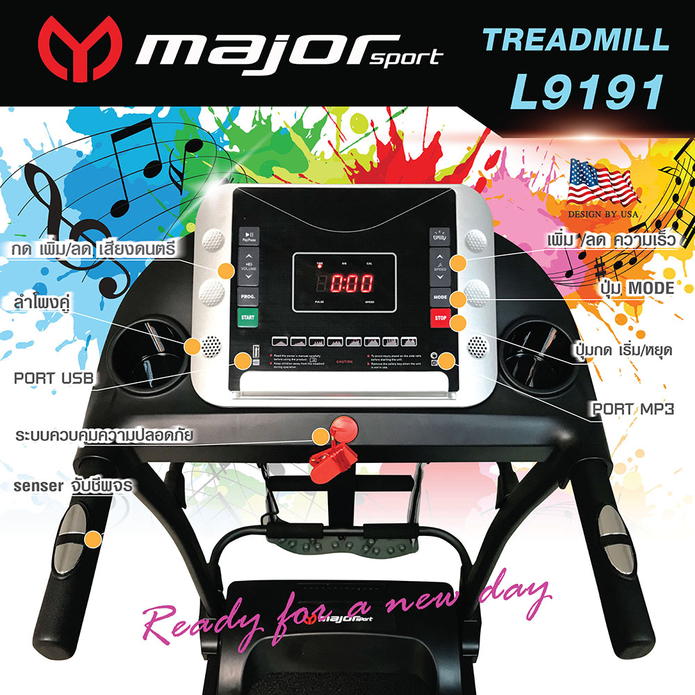 แสดงผลด้วยจอ RED LED (เวลา, ความเร็ว, ระยะทาง, แคลลอรี่, ระดับการเต้นหัวใจ, 12โปรแกรมอัตโนมัต, ตัวเลือกฟังก์ชั่น, ช่องเสียบ USB, MP3)