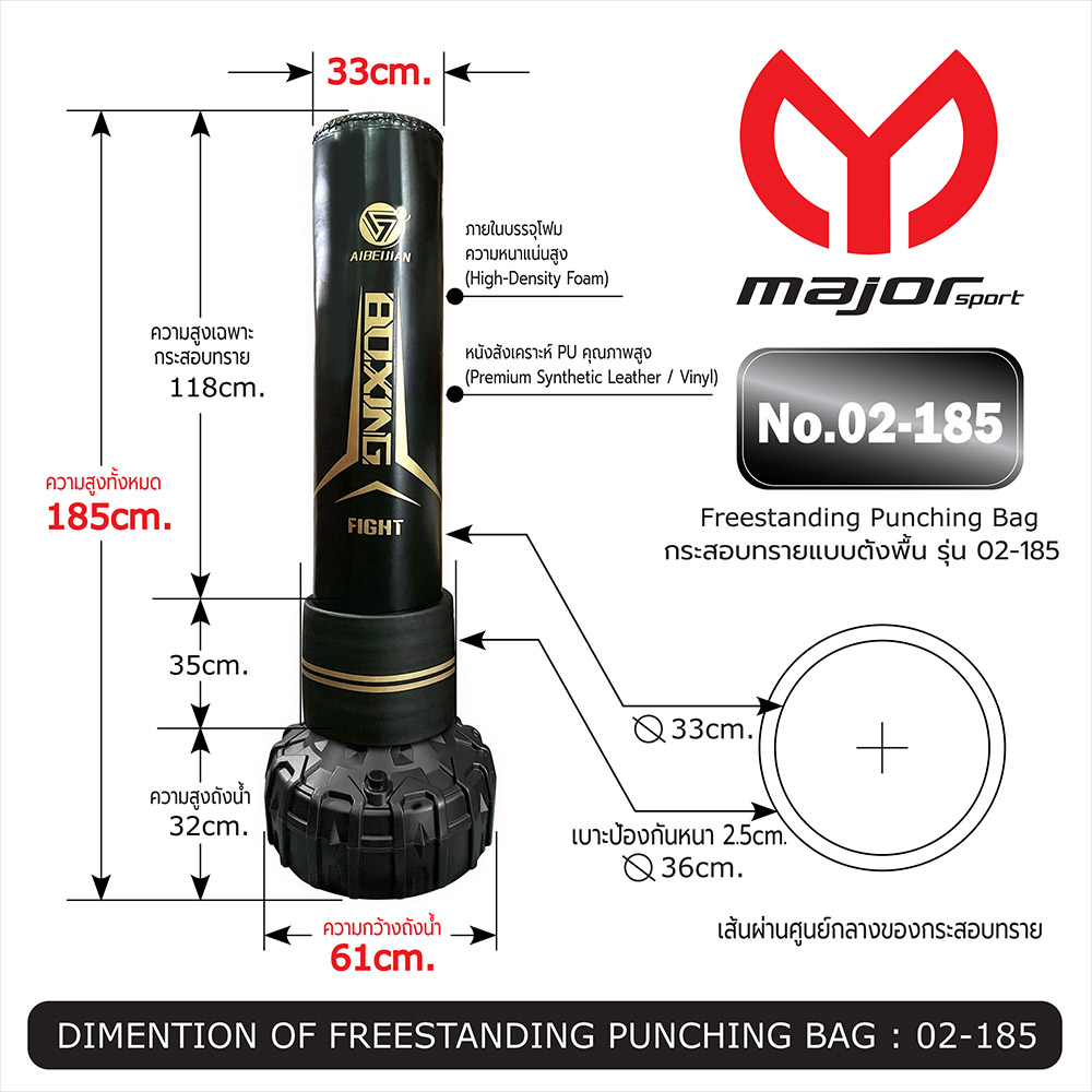 6. ขนาดของกระสอบทราย (Size of Heavy Bag) : เส้นผ่านศูนย์กลาง 33 ซม. / สูง 125 ซม