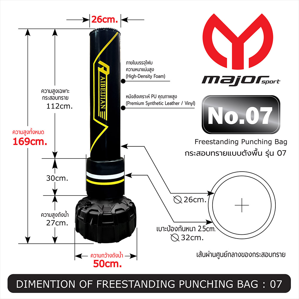 6. ขนาดของกระสอบทราย (Size of Heavy Bag) : เส้นผ่านศูนย์กลาง 26 ซม. / สูง 112 ซม
